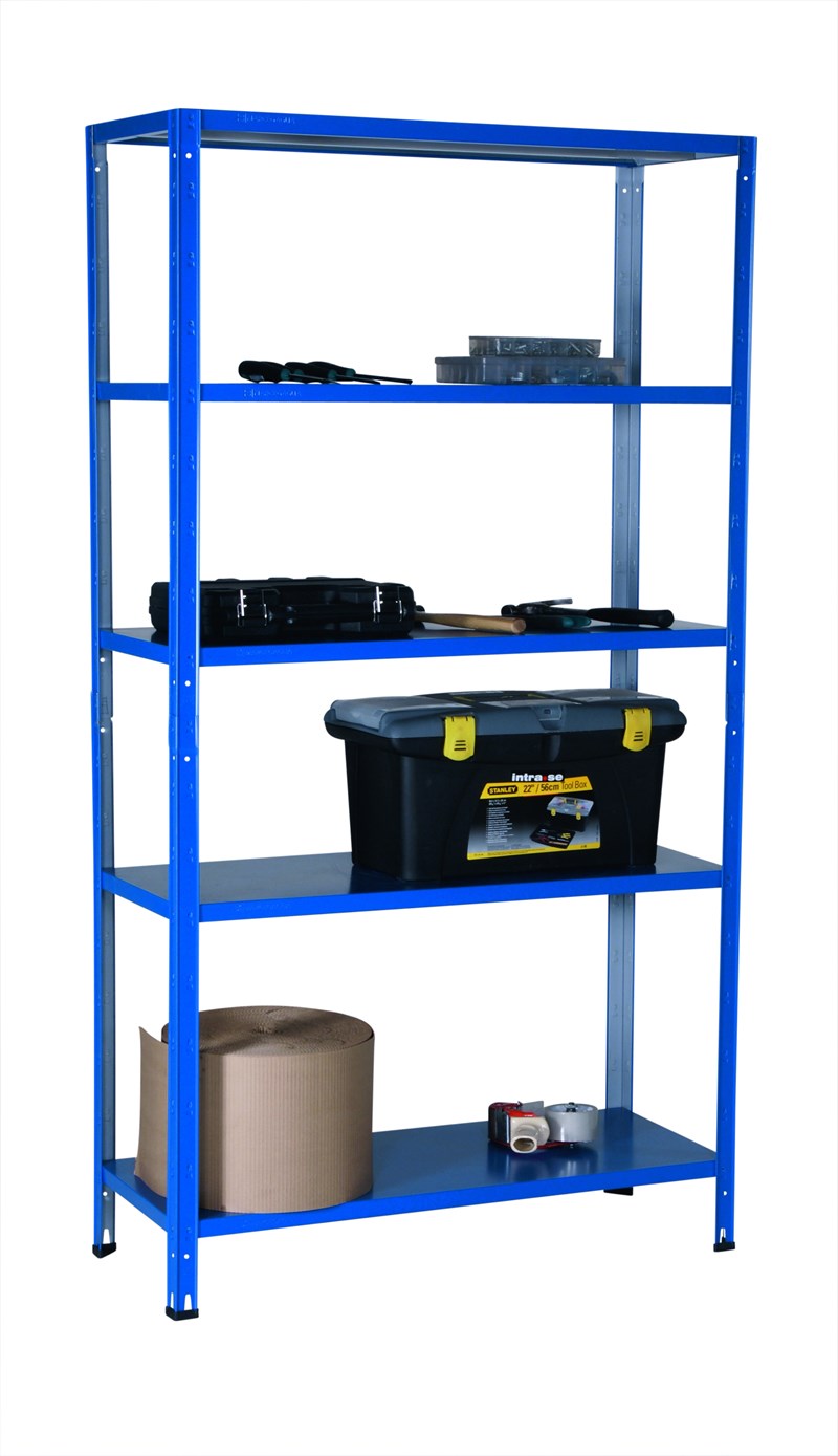 Kompakt og smart reol for lager, verksted, arkiv, kontor, butikk, m.m. Monteres raskt og enkelt uten skruer, bolter og muttere. Solid forsterket hyller garanterer 70 kg jevnt fordelt per hylleplan. Leveres lakkert blå RAL 5010. Kan med fordel festes i veggen. Leveres komplett med 5 hyller.